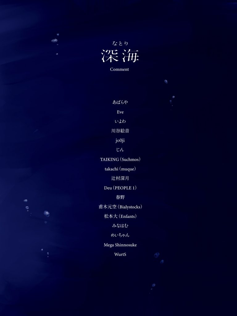 アルバム「深海」に際しコメントを寄せたのは、あばらや、Eve、いよわ、川谷絵音、jo0ji、じん、TAIKING(Suchmos)、takachi(muque)、辻村深月、Deu(PEOPLE 1)、春野、甫木元空(Bialystocks)、松本大(Enfants)、みなはむ、めいちゃん、Mega Shinnosuke、WurtSの計18名!!(あいうえお順)